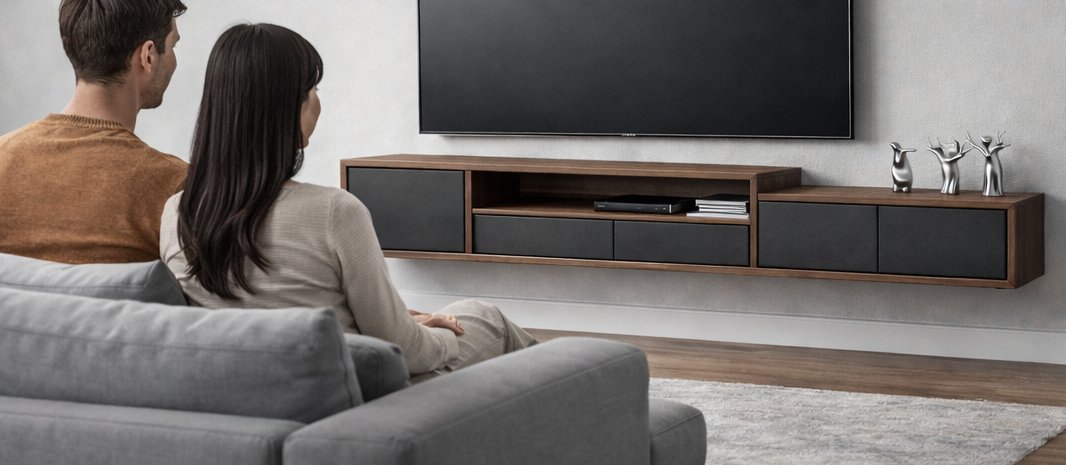 میز LCD دیواری مدل پلکانی تیره از مجموعه محصولات REY DESIGN، ترکیبی از طراحی خلاقانه، کاربردی و مدرن است. فرم پلکانی این محصول باعث ایجاد عمق بصری و تمایز در دکوراسیون شده و آن را به انتخابی خاص برای فضاهای امروزی تبدیل میکند.این میز بهصورت شناور (دیواری) نصب میشود و با حذف پایهها، ظاهری سبک، مینیمال و مرتب به فضای نشیمن میدهد. رنگ تیره دربها در کنار بافت چوبی بدنه، حس لوکس و حرفهای به محیط القا میکند.فضای مناسب برای قرارگیری دستگاههای صوتی و تصویری، کتابها و اکسسوریهای دکوری، این محصول را به گزینهای کاملاً کاربردی برای استفاده روزمره تبدیل کرده است